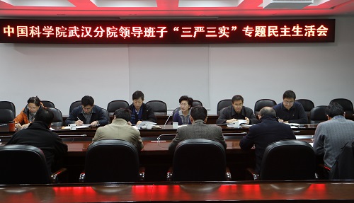 根据中央和中国科学院党组关于“三严三实”专题教育的要求和部署,中科院武汉分院党组于12月22日召开了领导班子“三严三实”专题民主生活会。武汉分院院长、党组成员袁志明,党组书记、副院长陈平平,副院长、党组成员李衡,党组副书记、纪检组组长尚纳新参加了会议。院巡视组办公室副主任毕金初、院人事局领导干部处副处长许冬到会指导。分院中层干部、中科实业公司和育成中心负责人列席参加。会议由陈平平主持。