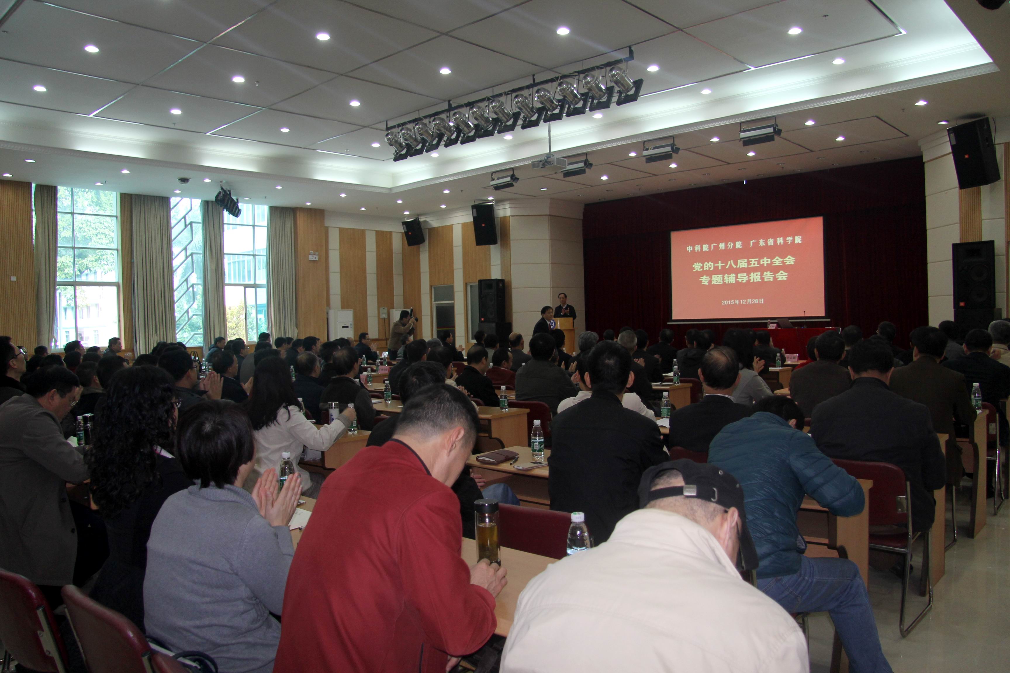 12月28日,中国科学院广州分院联合广东省科学院在分院机关举办党的十八届五中全会专题辅导报告会。大会特邀云南省委宣讲团成员、云南省委党校(云南行政学院)党委委员、云南省有突出贡献的哲学社会科学知名专家欧黎明作“党的十八届五中全会精神宣讲”报告。报告会由省科学院党委委员郭俊主持。