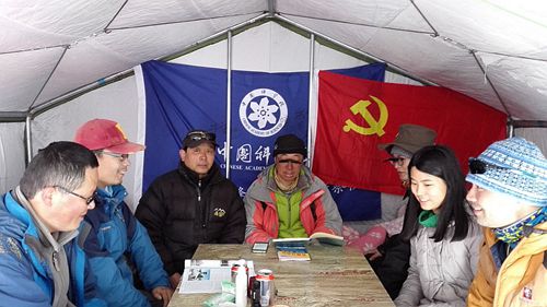 临时党小组成员以中科院寒旱所冰冻圈与全球变化研究室党员为主,中科院青藏高原研究所、北京大学、山东大学的野外科考党员一并参加学习,其他工作人员列席。“两学一做”讲话极大地鼓舞了在高寒缺氧环境下科考人员不畏恶劣环境的斗志。目前,大气化学的监测正常,15人一直坚守在海拔6350米的高山营地,在吃住行极其艰苦的环境下,每日开展冰川监测、雪冰样品采集和冰芯钻取工作。