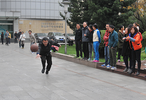 运球接力比赛中,每队6名球员单手拍球完成接力,摔倒、掉球、双手触球都算违例,大家都认为此项比赛比的速度与激情,可万万没想到最后拼的是稳健,最终只有两个队顺利完成比赛,农业中心获得冠军,情报中心、公共实验联队获得亚军。