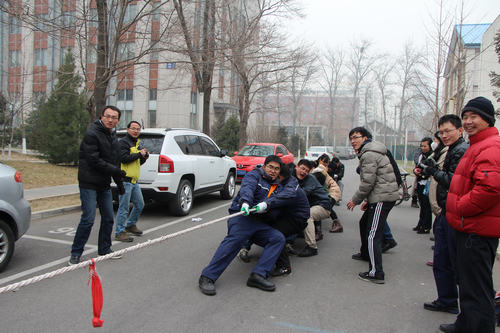寒风凛冽、天气阴沉,这不但没阻挡大家的斗志,反而激发了大家的激情。比赛尚未开始,研究所大楼前就已经聚满了人,大家无不卯足了劲。中午十二点半,随着一声哨响,拔河比赛正式开始。各队的运动员精神抖擞地上了阵,他们摆好架势,两眼注视着队方,双手像铁钳一样紧紧地抓住大麻绳,队员们口中整齐地高呼着“一二,一二”,憋足了劲往后拉。有的同学们就使出吃奶的劲,像一头头斗牛似的死命地往后拉;有的同学肌肉紧绷,筋脉突出,一会儿工夫脸上就渗出了汗珠;还有好多同学的手都被绳子勒得发红,他们还是咬紧牙关,忍着疼痛,一个劲儿地拉着。其余师生自发组成拉拉队在队伍旁加油助威,恨不得抓起绳子与队员一起努力。呐喊声、加油声此起彼伏,震耳欲聋,响彻整个研究所。