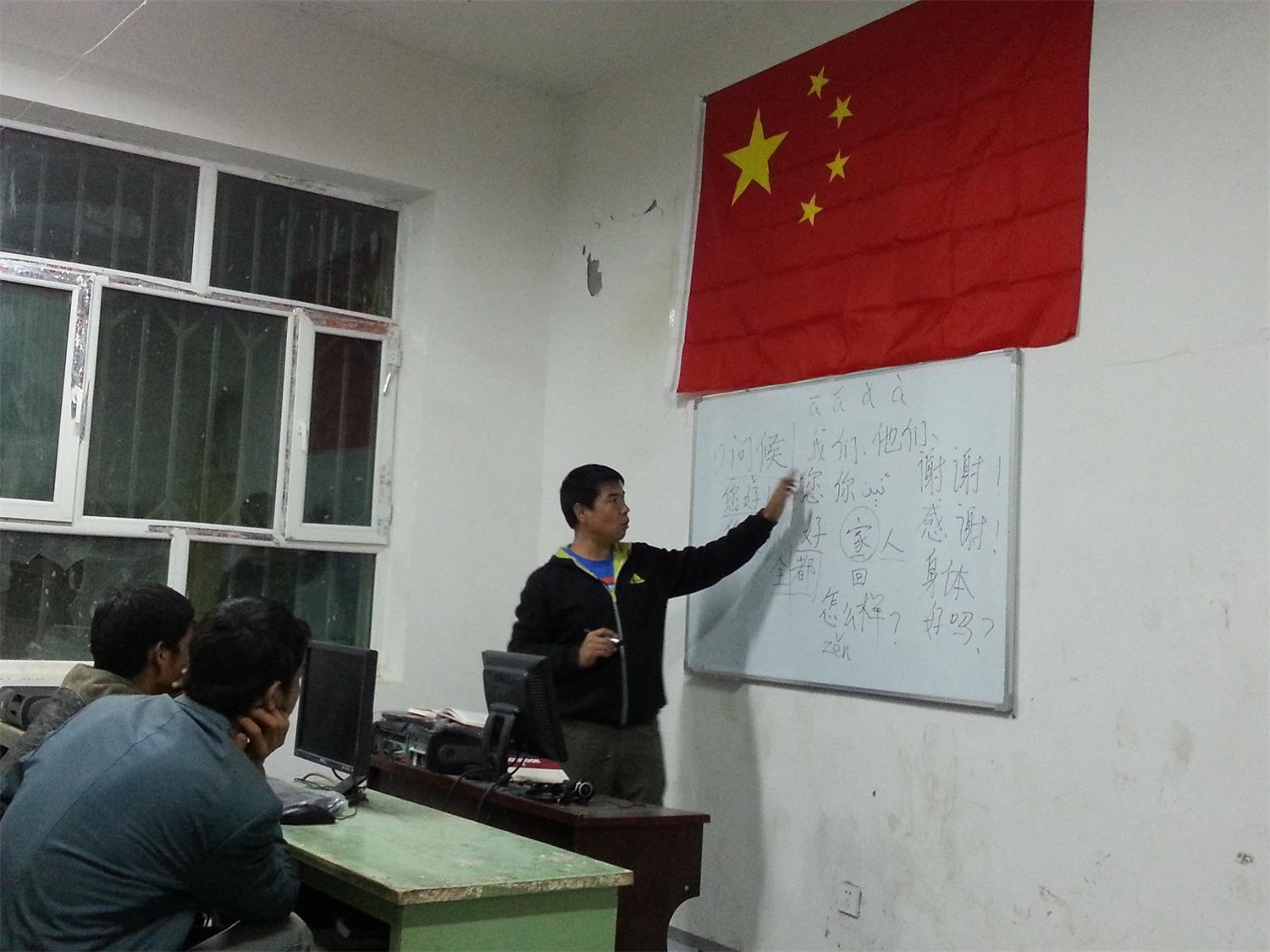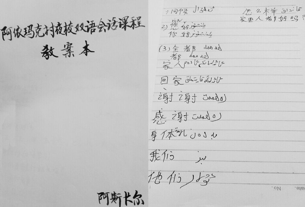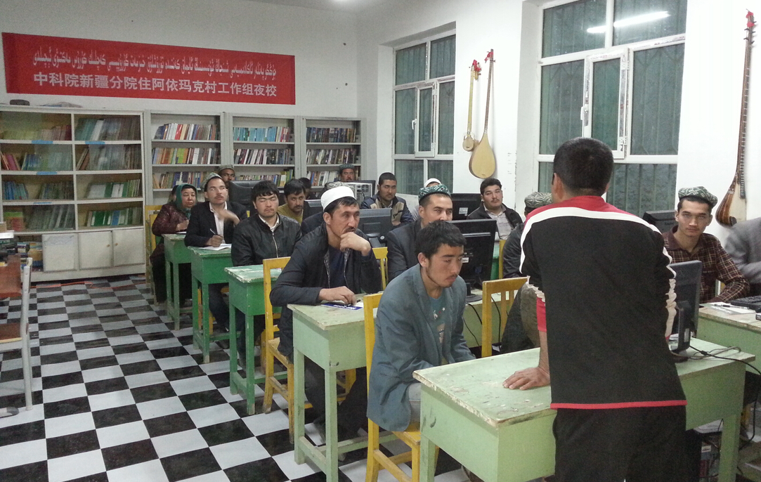 4月6日,墨玉县加罕巴格乡阿依玛克村的30名村民在村委会文化室——中国科学院新疆分院捐建的电教室,跟着“访惠聚”工作组副组长苏力坦、成员阿斯卡尔·伊敏开始学习国家通用语言日常生活句子、词组以及种植、养殖新技术……新疆分院住加罕巴格乡阿依玛克村工作组夜校开学了。“您好,身体怎么样?您家里都好吗?……”一遍又一遍整齐又洪亮的声音从村委会文化室传来。今天的学习先从“问候”开始,台上“老师”指着黑板上写好的汉字示范和拼音、维文标注,台下“学生”跟着朗读学习。