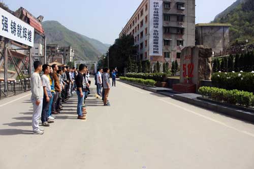 在原北川老县城地震遗址,师生们自发举行了一个简短的哀悼仪式,沉痛悼念5.12地震中的逝者。