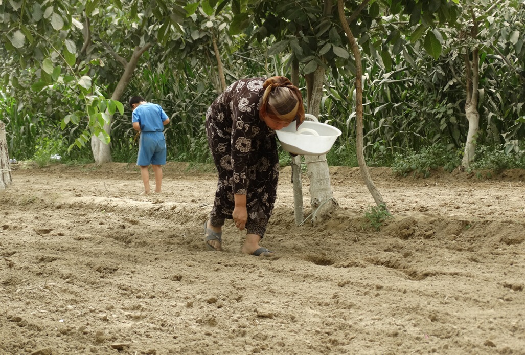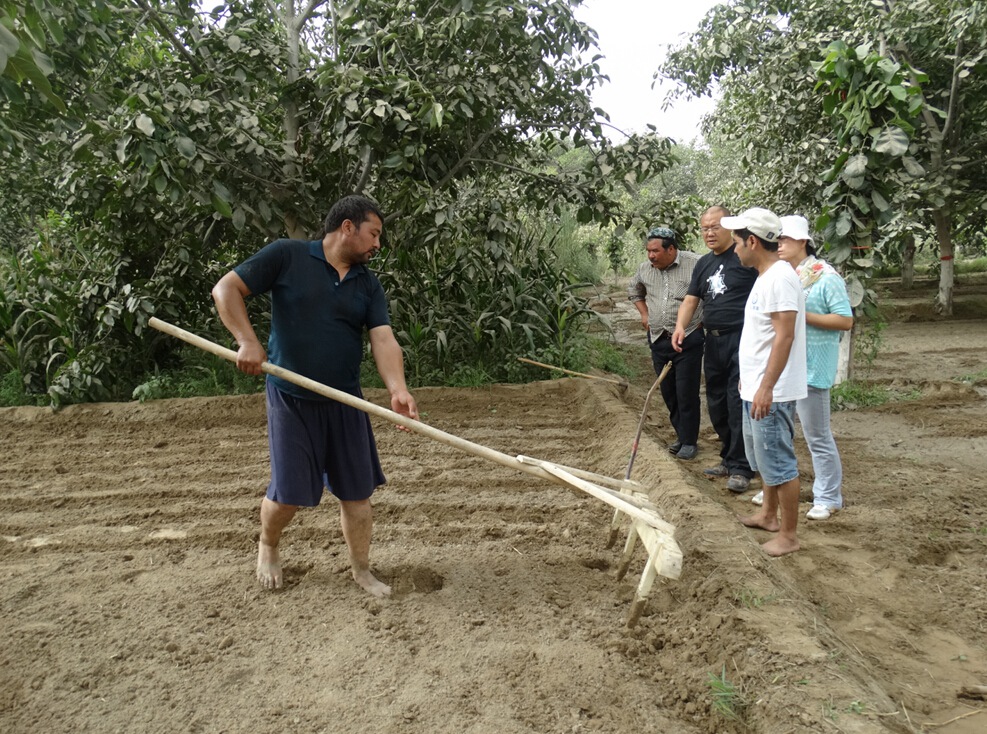 7月28日,烈日炎炎,酷暑难耐,在阿依玛克村一片核桃林下,住村工作组成员、中国科学院新疆理化技术研究所资源化学学科科研人员和农民正在热火朝天地忙着种植维药,虽然汗水早已流满脸颊,浸湿衣背,但每个人都面带笑容,热情如骄阳一样火热。农民用自制的播种工具精确控制播种行距,严格按照技术人员的要求进行播种、培土,“林下种植维药试验示范”项目正式启动实施。