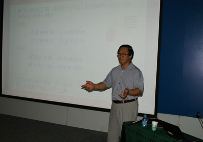 讲座中,张志刚为大家首先介绍了佛教在印度的由来和产生过程,分析了佛教之所以能传入中国并在我国流传和发扬的原因,还介绍了位于我国的佛教名山。随后,他为大家重点讲述了佛教的教义和制度,并引出了佛教教派中与中国文化结合最为紧密的禅宗的由来和发展过程。张志刚通过诸多优美的诗歌,向听众阐释了禅宗的要义和思想精髓,并列举了若干风趣幽默的生活禅、口头禅、网络禅,从中挖掘其智慧内涵。最后,张志刚还为大家简要介绍了佛教的仪轨。