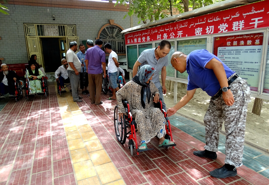 8月10日上午,新疆分院住阿依玛克村工作组与村干部一起将轮椅一辆辆送到急需帮助的村民手中,工作组成员还耐心细致地为老人讲解轮椅的使用方法和注意事项,帮助老人熟悉和使用轮椅。