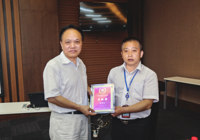 刘中民代表大连化物所为蹇锡高颁发了文化讲坛贡献奖奖牌。