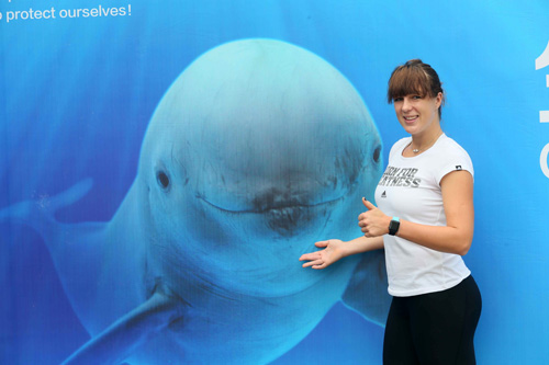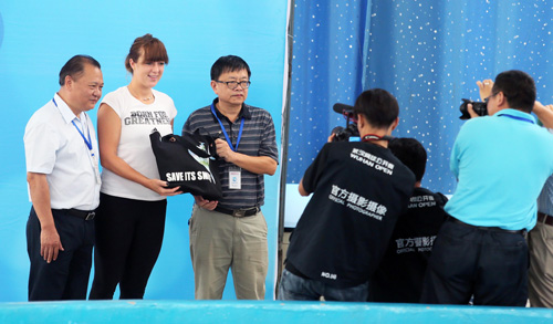 水生所研究员王丁介绍了关于长江江豚的研究和保护工作。所长赵进东代表水生所向帕夫柳琴科娃赠送礼物,并预祝她此次赛事取得好成绩。帕夫柳琴科娃参观了人工饲养的长江江豚,亲身参与江豚喂食和训练,在长江江豚纪念品上签字留念并与工作人员及志愿者合影。她呼吁大家共同关爱长江江豚,留住江豚的微笑。