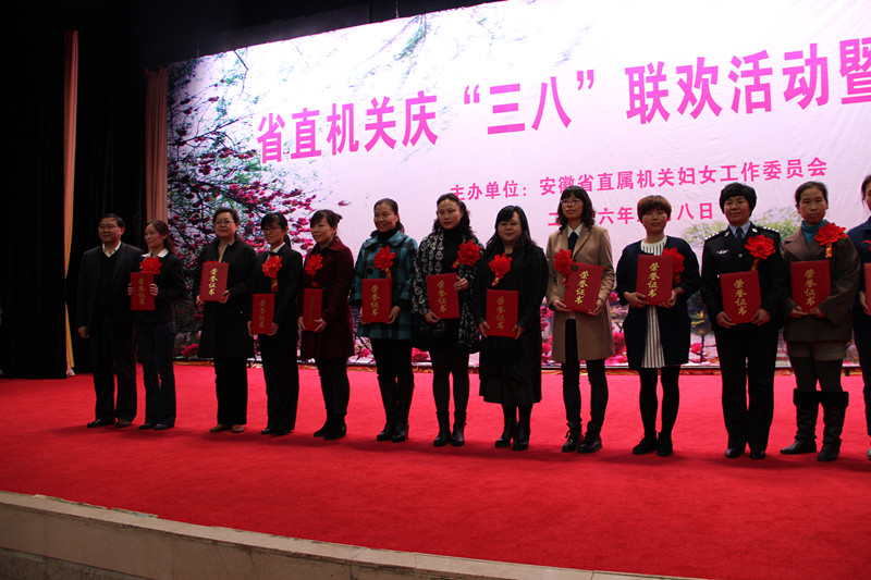3月8日下午,庆祝“三八”国际劳动妇女节106周年暨2016年安徽“省直机关三八红旗手(集体)、先进妇女组织和优秀妇女工作者”颁奖典礼在安徽省稻香楼会议厅举办。中国科学院合肥物质科学研究院技术生物与农业工程研究所“现代农业与生态安全协同创新团队”在省直机关100余个单位中脱颖而出,被授予“三八红旗集体”光荣称号。