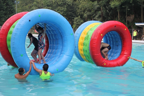 看到碧蓝的池水,换上游泳装备的队员们欢呼雀跃起来,大家纷纷摩拳擦掌,准备在即将开始的水上拓展项目上一展身手。水上拓展项目共设计了五个项目,分别是“奥运五环”、“水中漫步”、“盲人渡河”、“水上打捞”和“团结一心”。