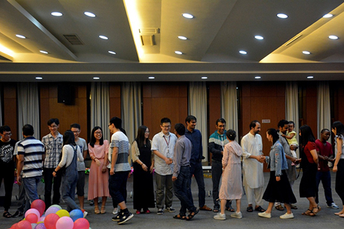 赏月晚会在主持人王杰与许粲的欢迎辞中拉开帷幕。由于平时忙于科研,所内研究生鲜有机会与留学生进行面对面的交流沟通,在主持人的热情调动下,破冰融合环节开始了。大家排成两列互相握手认识,并做简短的英语自我介绍。待相互熟络后,晚会进入到游戏环节,在“爱的抱抱”与“月饼传情”游戏中,大家玩作一团,欢声笑语回荡在报告厅。尽管当晚天空不见明月,晚会特意为大家播放了赏月视频。