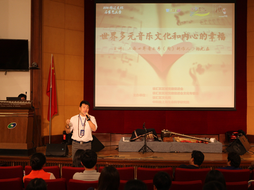 讲座在一曲充满异域风情的印度即兴打击乐中拉开序幕,上海生科院党委副书记、副院长倪福弟出席活动并致辞。杨光磊结合自身音乐经历,从民间音乐与现代音乐的相互独立、相互融合等多角度,和在场听众分享了他对世界多元音乐文化的理解。他讲述了打造“上海世界音乐季”的背景,以及在组织探索过程中对于内心的感悟,并希望以此为平台,让更多原始音乐文化得以聚集展示,广泛传播,深入民众内心。