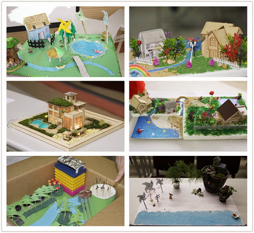 GENES团队名称的五个字母分别代表Green、Ecology、Nature、Energy、Science五个单词。他们以可持续发展为理念,利用实验室的一些简单材料和废弃的零食盒制作了模型的农田、污水处理厂、风力发电站、花园、蓄水池和居民区六大主体部分,同时辅以绿色卡纸制作的草坪和森林,现代而时尚。“逐绿”团队的三个女生以“心乐园,用心做,才快乐”为口号,修建了一座“生态部落”。模型分为主屋、梦屋和杂货铺三个部分,主屋由百余根小实木建造而成,屋前花园、草坪、游泳池、沙滩应有尽有。通往梦屋的是一座五彩斑斓的彩虹桥,屋后是一片蔚蓝的大海,大海上漂浮着红色的小船,沙滩上铺满洁白的细沙,这个模型圆了三位女士心中的“公主梦”。“奇异果组合”团队的模型包含了风车、马路、房屋、森林等元素,营造了浪漫闲适的农家田园氛围; “芝华塔尼欧”团队的名称来自电影《肖申克的救赎》,他们利用改造后的花盆和小盆景制作了一个“面朝大海、春暖花开”的理想圣地。“四个粉刷匠”团队建了一座灯火明亮的城堡,屋前用苔藓做成草坪,屋顶上设计了多肉植物制作的生态花园,另外,他们还在院子里建了凉亭,并用新鲜的桂花铺满了地面。“四个粉刷匠”团队将制作的生态城堡模型命名为LIN House,作为礼物送给他们的导师徐麟老师,体现了研究生对导师的深厚感情。