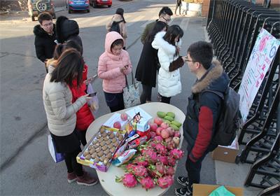 早晨7:30,活动在研究所正门前拉开帷幕。本次活动主要分为两个环节,首先是参与活动的女生现场关注DICP研究生会微信公众号并留言写下自己的心愿,便可领取研究生会精心准备的爱心水果一份,200份“爱心”分批送出,送完为止;然后是在留言的女生中随机抽取10名幸运女生送出丰厚的幸运大礼包,并将留言女生的心愿在微信公众号中进行推送,等待着有心的“他”来实现。