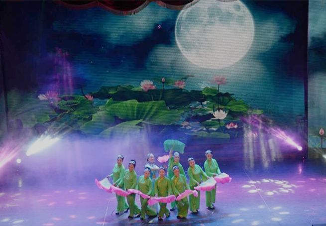 舞蹈《荷塘月色》将伞舞和扇舞完美融合,舞台背景的月光如流水一般静谧,随着动听的旋律,优美的舞姿,仿佛带着观众走进一片波光粼粼的荷塘,展现了民族舞蹈的风韵。