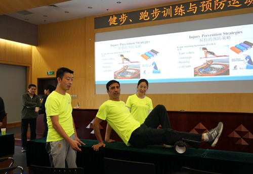 随后阿布细致地为大家讲解了健步和跑步的专业知识,他从服装、运动鞋、饮食、饮水、热身、拉伸、运动类型等方面为大家全面介绍了健步和跑步知识,讲解了常见运动系统损伤预防和紧急治疗等损伤的防治及康复知识,并亲自示范拉伸动作要领。在交流环节中,阿布还为大家从中老年群体跑步知识、合理健康饮食、服装的选择方面解答大家跑步中遇到的各类问题。