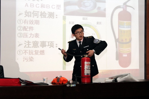 黄伟屹结合典型火灾案例,从常见多发的家庭火灾、电器火灾、汽车自燃、公共场合逃生等方面介绍了火灾等给社会、家庭带来的惨痛教训,利用各种教具向在座的师生详细介绍了日常防火常识、各种灭火器的使用方法、火灾扑救措施、火灾自救及他救等应注意的事项。