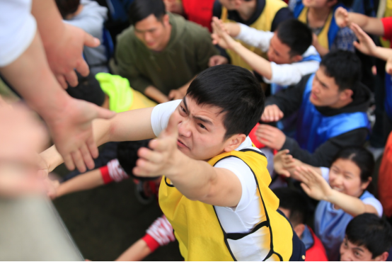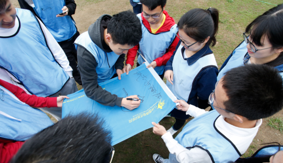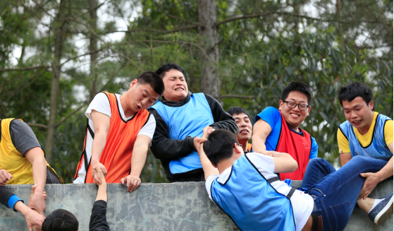随后开始了第一个热身活动——群龙取水。该活动仅依靠队友的身体力量,在不触地不触线的条件下,所有队员依次从距离端线约2米的地方取回当日活动的饮用水。第二个是高空项目——勇攀天梯,团队队员两两合作,相互帮助,攀爬6米高的天梯。尽管天空下起了小雨,但仍然阻挡不了大家勇攀高峰的激情。下午四个小队分别完成了“抢滩登陆”的热身游戏后,开始了另一个团队协作的项目——呼吸的力量。在这个项目中,小组内分为三种角色——领导者、沟通者、执行者,分工合作,共同完成呼吸机的搭建,并采用吹爆气球的方式验证呼吸机的成功搭建。最后,迎来此次拓展活动的高潮部分——毕业墙,全队所有成员不借助任何外界的工具、在21分钟44秒内成功翻越了一面高4.2米的光滑水泥墙面。当最后一个人顺利翻越时,全体同学都忍不住鼓掌、拥抱,并流下了激动、感动的泪水。