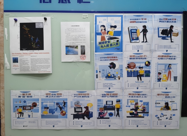 上海天文台始终重视网络信息安全工作,每年面向全台网络用户开展网信宣传教育和培训活动。为贯彻落实国家网信工作精神,2021年活动周期间,以海报张贴、视频展播等形式进行网络信息安全科普宣传,内容覆盖免密开放无线局域网泄密陷阱、网银手机支付盗刷、移动充电站安全、监控摄像头安全、网络诈骗、钓鱼邮件、密码安全、勒索病毒等在日常工作和生活中容易造成信息泄露、遭受网络攻击的各种情况。