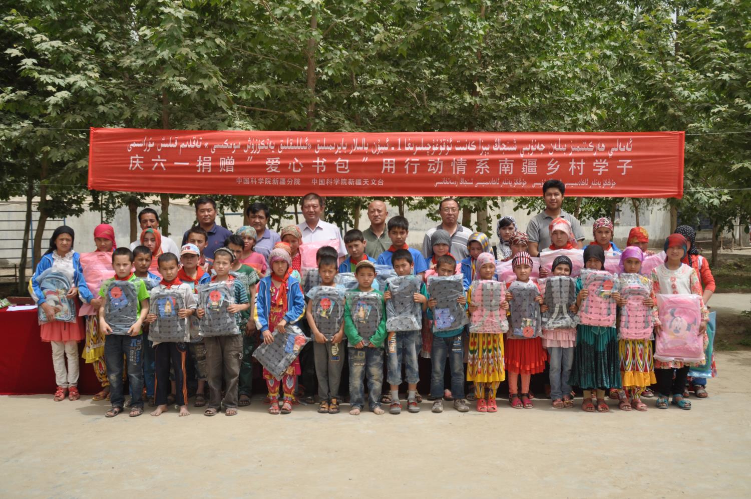 新疆分院参加自治区集中整治工作队员吕卫东、艾尔肯在入户走访过程中,发现许多村民家正在上学的孩子,因家庭贫困,书包变成了一件奢侈品,拎一个塑料袋代替书包上学的现象很多见。工作队员及时向分院领导反映情况,经征得分院领导同意后,购买了价值3000余元书包,在“六一”期间开展送书包活动。同时,新疆天文台党委也给予了大力支持,使受捐助的孩子范围更大。