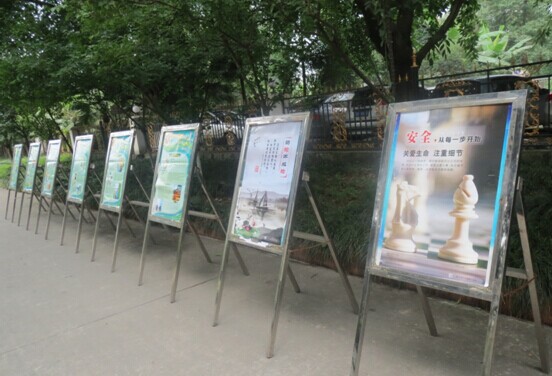 工作人员在所园区悬挂“安全生产月”宣传横幅,横幅内容为“强化红线意识 促进安全发展”、“广泛深入开展全国安全生产月活动”、“落实安全规章制度 强化安全防范措施”;在工作区大门口摆放“员工职业健康”宣教展板;在生活区橱窗粘贴“社区安全”、“交通安全”宣教挂图;各部门发放“生产事故隐患排查与治理”宣教挂图及用电、消防等安全知识宣传单,通过这些方式营造安全月活动氛围。