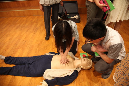 讲座尾声,在医护人员的指导下,在场人员纷纷上台用人体模型进行了徒手心肺复苏、止血等模拟操作训练。本次讲座为大家在险情、灾情发生的第一时间开展科学、正规的现场急救打下了坚实基础。