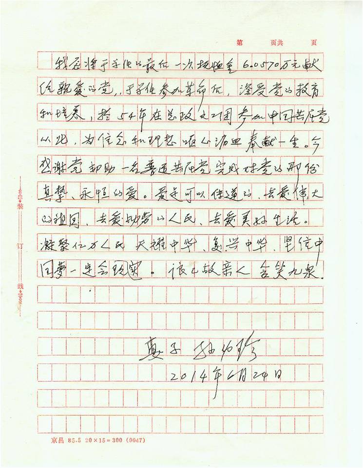 “我老伴能够陪我这么长时间,都是因为党的关怀和出版社的帮助。”此时此刻,孙幼珍老人对党的感激,对出版社的感谢化作眼角的泪光闪烁。在出版社党委书记李锋、副书记来豫蓉面前,她从黄色的破布口袋里掏出一个塑料口袋,里面整齐的装着六万零五百七十元人民币,这是科学出版社在于学任离世后一次性发放的抚恤金,孙幼珍亲自到银行如数取出,还叮嘱银行工作人员尽量要崭新的人民币,她不想麻烦出版社,拒绝单位派车接送,为了不引人注意她用破布口袋装钱,遵照于学任生前的愿望,将这份沉甸甸的深情交到书记手中。一直保持微笑的她声音突然哽咽的说:“钱很少,但是表达了我们对党的爱,他再也不能为党做些什么了,这是他最后的心意,感谢你们帮助他完成最后的心愿。”与党费一起交到书记手中的,还有孙幼珍老人亲笔书写的一封信,她的视力已经很微弱,在放大镜的帮助下写了这样一段平实但震撼人心的话:“我愿将于学任的最后一次抚恤金6.0570万元献给亲爱的党,于学任参加革命后,深受党的教育和培养,于54年在总政文工团参加中国共产党,从此,为信念和理想呕心沥血奉献一生。今感谢党帮助一名普通共产党(员)完成对党的那份真挚、永恒的爱。爱是可以传递的,去爱伟大的祖国,去爱勤劳的人民,去爱美好生活。凝聚亿万人民,天耀中华,复兴中华,坚信中国梦一定会实现。望已故亲人含笑九泉。”