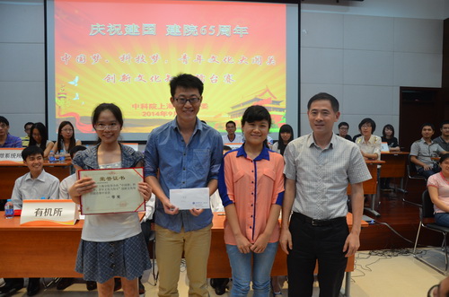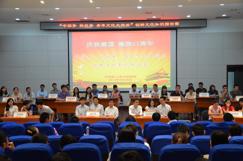 为进一步推进实施中国科学院“率先行动”计划,迎接建国建院65周年,9月28日下午,在上海分院团委举办的“中国梦、科技梦,青年文化大闯关”创新文化知识擂台赛上,上海生命科学研究院的团员青年代表同沪区其他11支参赛队伍同台竞技,经过必答题、抢答题、爱国主义歌曲题、现场书写题以及选答题等五轮激烈的比赛,最终以194分的高分夺得本次比赛的第一名。