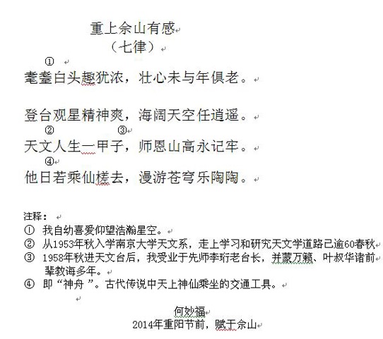 9月29日下午,在佘山科技园区召开了退休台领导座谈会,在上海天文台领导岗位上退休的6位老领导以及全体现任台领导参加了座谈会。座谈会上,洪晓瑜台长代表台领导向大家致以节日的祝福,对退休老领导长期以来对单位工作的支持表示衷心的感谢,并恳请大家对上海天文台的工作多提宝贵意见,同时也向老领导们通报了中科院“率先行动”计划的主要精神和上海天文台近期的主要工作,希望他们继续关心和支持上海天文台的发展。在座谈会前,还组织老领导参观了上海天文台在佘山地区的几处台站和佘山科技园区。老领导何妙福欣然赋七律一首,抒发了自己一生情系天文事业的美好情怀,详细内容附后。