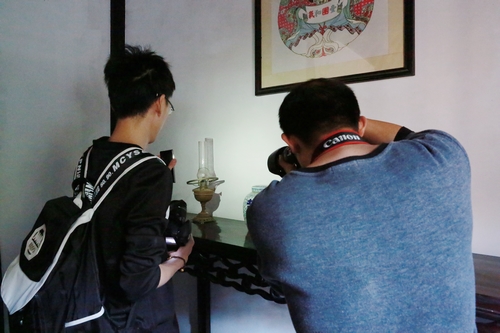 雕花楼的精妙之处在于,早晨的阳光倾泻在彩色玻璃窗、窗棂、走廊或房间的各个角落,折射出奇幻迷离的魅影。在摄影课指导老师小河有雨的指导下,摄影爱好者们纷纷拿起手中的相机——调整光圈、快门、角度、焦距,构思色彩、光线、构图,或躺、或坐,或广角、或特写………一声声清脆的快门声将雕花楼精美的雕刻、斑驳的光影、精美绝伦与沧桑丰姿都定格在记忆中。清代诗人俞越以“花落春仍在”形容雕花楼,而通过摄影,大家则真正感受到——人去情未尽……