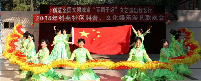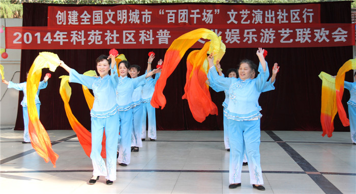 “百团千场”文艺演出社区行活动,由武汉市委宣传部、市文新广局主办,区文体局、各街道承办。武汉分院积极组织离退休老同志参加此次联欢会,与科苑社区共同吹响“文明创建”号角。