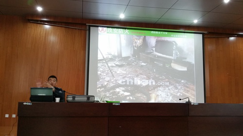 何宗军结合2013年、2014年全国及青海省发生的典型火灾案例,从常见多发的汽车自燃、电器火灾、公共场合逃生以及家庭火灾入手,通过触目惊心的案列和惨痛的教训,引发大家对火灾发生普遍原因的思考,同时利用各种教具向在座的师生详细介绍了日常防火常识、火灾燃烧周期、各种灭火器的使用方法、火灾扑救措施、火灾自救及他救等应注意的事项,对如何预防火灾和消除火灾隐患进行了指导。
