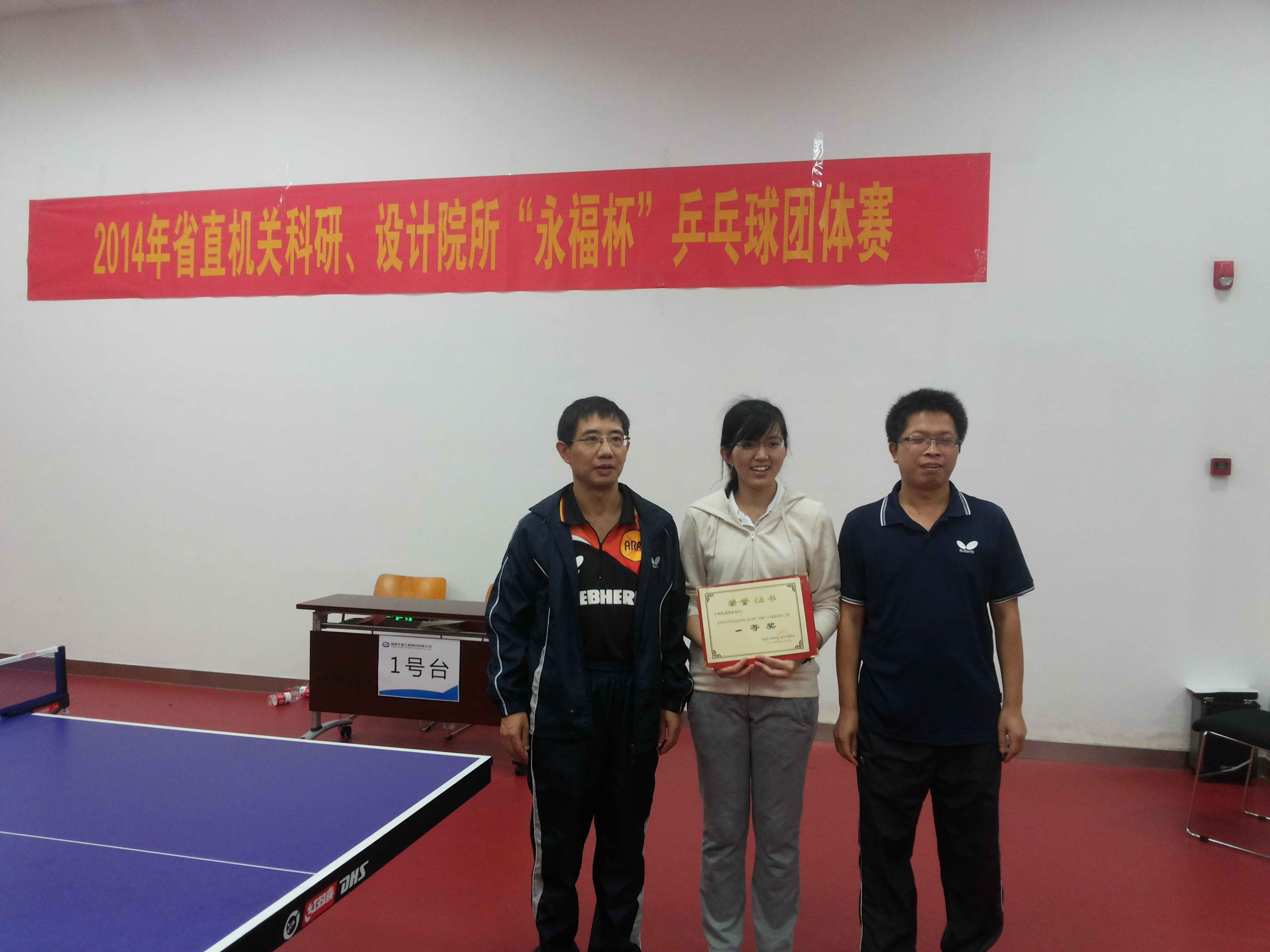 2014年福建省直机关科研设计院所“永福杯”乒乓球团体赛于11月7日至8日在福建省永福集团举行,共有来自省直机关科研设计院所工会的38支代表队参赛,福建物构所代表队不畏强手,敢打敢拼,顽强拼搏,以全胜的战绩获得团体冠军,取得比赛成绩和精神风貌双丰收。