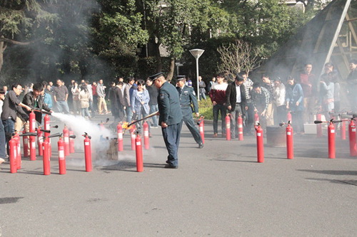 警铃拉响后,大楼工作人员、学生在疏散组指引下,陆续从两侧消防楼梯疏散至新大楼外空旷地带。消防水枪到位,对准着火部位进行喷淋灭火。与此同时,大楼前还设置了油桶,供职工及研究组学生学习使用二氧化碳灭火器。至此,消防演习圆满完成。