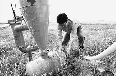 中科院石家庄农业资源研究中心的科研人员邵立威在河北省南皮县乌马营镇白坊子示范区检查用于咸水微咸水混灌的过滤器。新华社记者金立旺摄