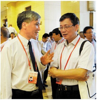 6月9日,两位“校长”在两院院士大会会场亲切交谈,一位是中科院副院长、中国科学院大学校长丁仲礼(左),另一位是中国科学技术大学校长侯建国。