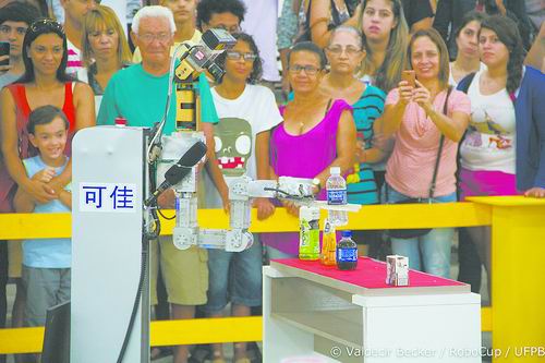 7月19日~25日,第18届RoboCup机器人世界杯比赛在巴西若昂佩索阿举办。由中国科学技术大学自主研发的“可佳”智能服务机器人,首次夺得服务机器人比赛冠军(见上图)。