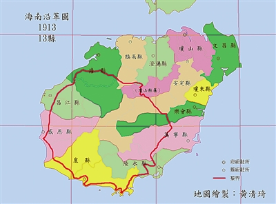 民国初叶的1913年海南废州置13县,崖州、儋州分别易名崖县和儋县,昌化、会同、万县3县分别改称昌江、琼东、万宁。某些县域的地理范围比清末时扩充较大。如定安的县域南抵五指山区,与崖县的北部为界;乐会西至今琼中的黎母山一带;儋州东南至莺歌岭腹地,与今琼中的红毛镇一带交界;崖县与陵水所辖的区域也较大,崖县北与今五指山的毛阳镇一带为邻,陵水东至五指山区的同甲,与定安的至水满