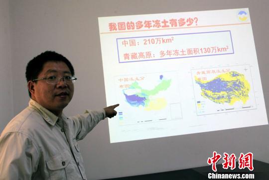 赵林研究员向媒体介绍中国多年冻土分布状况。孙自法摄