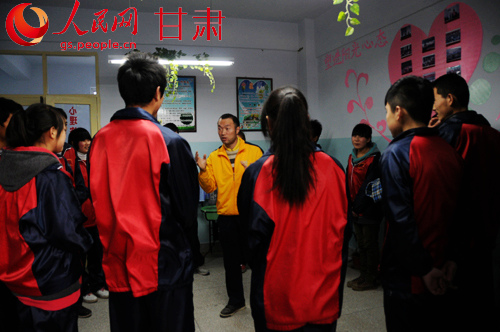 中科院心理所舟曲灾后心理重建项目志愿者刘飞在为舟曲一中的孩子做团体训练。