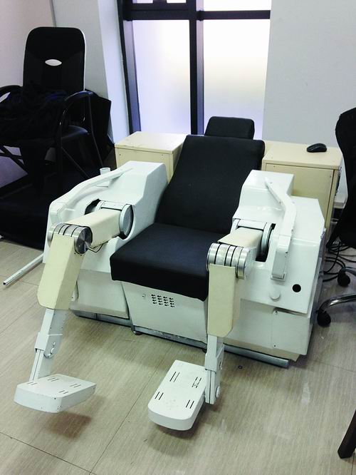 看起来像一个大躺椅,有着舒适的坐垫、夸张的金属“脚”,这其实是一个下肢康复机器人。它分为主动和被动两种类型,如果下肢稍微有力气,可以上下移动,机器人会顺着这个节奏和频率摇摆;如果下肢完全没有力气,机器人会自动摆动,进而帮助患者锻炼自己的下肢,达到早日康复的目的。