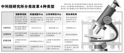 科研院所是科研活动的基本单元,其改革被认为是深化科技体制改革的关键。这也是“率先行动”计划选择的突破口和着力点。中科院秘书长邓麦村介绍,中科院的研究所将按照创新研究院、卓越创新中心、大科学研究中心、特色研究所等4种类型,推进研究所分类改革。创新研究院主要面向国家需求,卓越创新中心则面向基础科学前沿,大科学研究中心依托国家重大科技基础设施建设,特色研究所将依托具有鲜明特色的优势学科建设。根据不同的定位,这4类研究机构也将实行不同的资源配置方式、管理方式和评价方式。