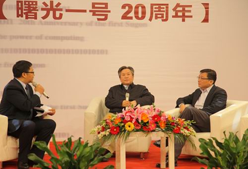 中国工程院院士李国杰(中)、历军(右)在“曙光一号”20年纪念会上。