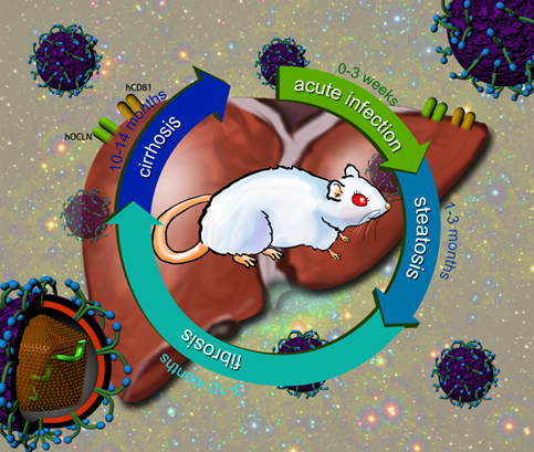 图解:使用转基因的方式将CD81, OCLN两个人的HCV受体表达在ICR小鼠肝脏中。这样的小鼠能够支持HCV持续性感染并表现出与人类似的丙型肝炎疾病进程:急性感染期—肝脏脂肪变性—肝脏纤维化—肝硬化。这是世界上首个HCV持续感染、完整反映HCV感染自然史和慢性病毒性肝炎进展的动物模型,将有力推动丙肝防治的疫苗和药物研发。