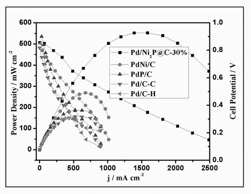 据介绍,该类催化剂在酸性环境中的活性、寿命、抗中毒能力及长效工作稳定性方面均优于商业催化剂和其他已经报道的催化剂。其中,利用该体系中的Pd-Ni2P/C作为DFAFC催化剂时其功率密度高达550 mW/cm2,较商业性能提高2.5倍,是目前所见文献报道的DFAFC的最高性能,相关研究成果发表于日前的《德国应用化学》上。目前,相关催化剂的批量生产正在进行中。