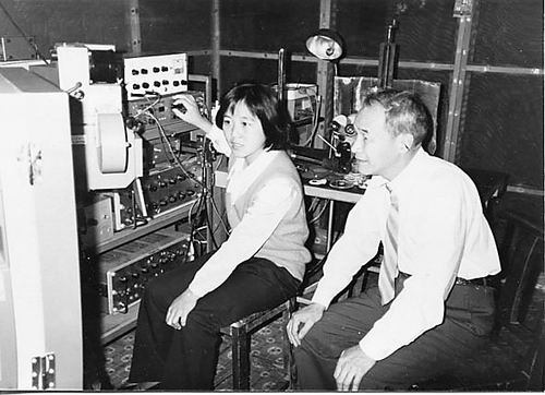 1987年,陈宜张与研究生华少莹在电生理实验室做实验。
