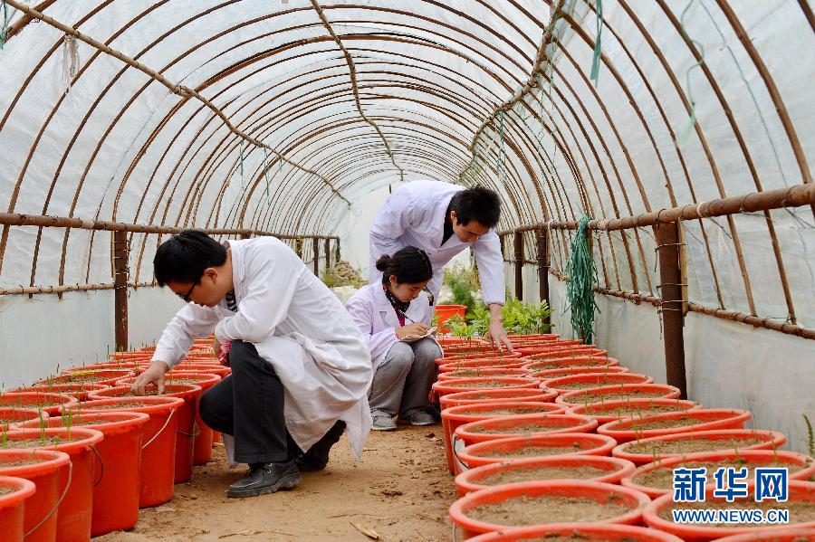 中科院南皮站工作人员在实验大棚内查看、记录试验农作物的生长情况。新华社记者 牟宇摄