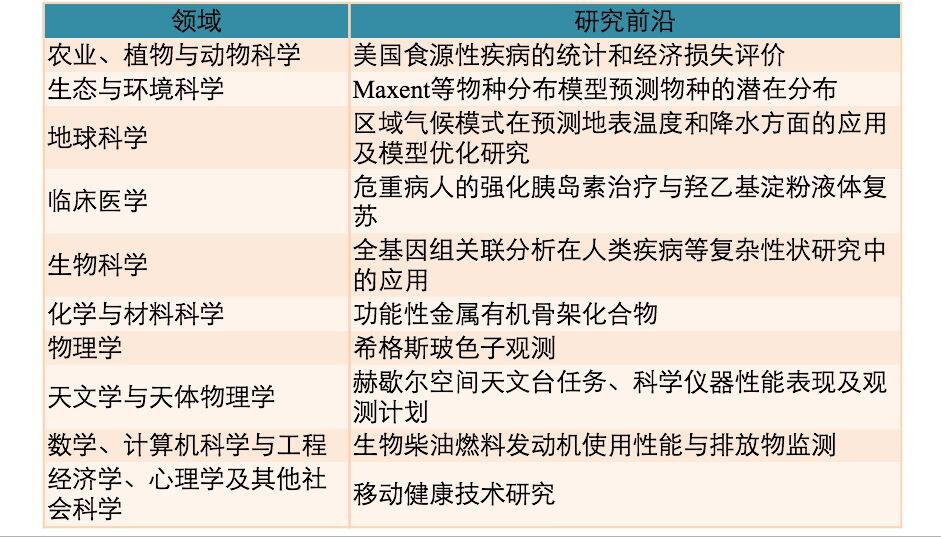 此外,中国科学院文献情报中心的情报研究人员还遴选出10大学科领域的19个研究前沿并进行深入分析。报告发现,针对Maxent等物种分布模型预测物种的潜在分布、全基因组关联分析、CRISPR/Cas基因组编辑技术、希格斯玻色子观测、高能量转换效率聚合物太阳能电池、移动健康技术等方面的研究非常活跃。