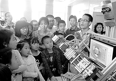 会玩魔方的机器人每次表演都吸引小朋友们围观。