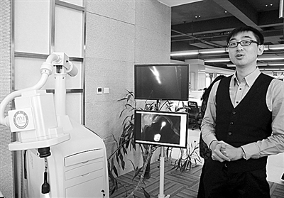 比如记者在自动化所还看到一款微创血管介入手术机器人,这款机器人融合了机器人、计算机控制和图像导航方面的技术,医生可以远程电脑操控机器人完成心脏冠脉搭桥等血管介入手术。